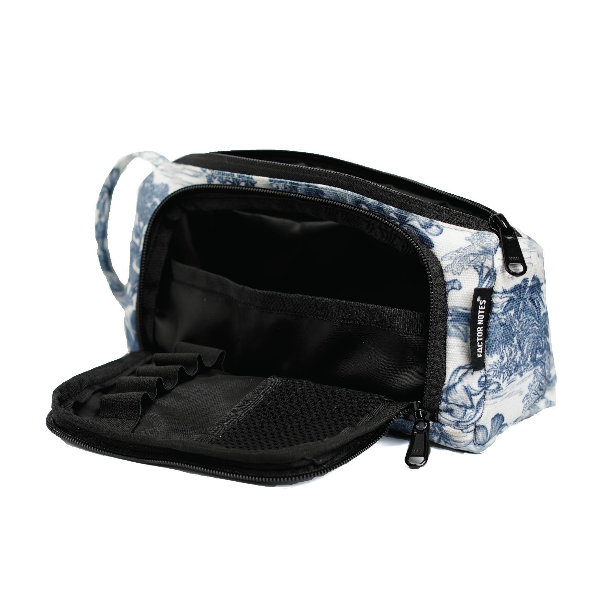 - Front zipper with pen holders and a small pocket