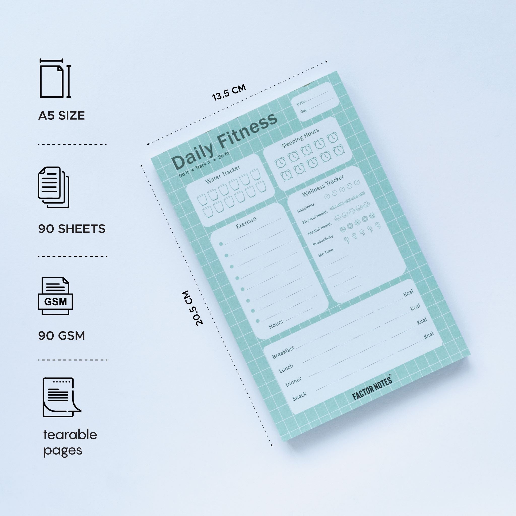- Features that matter: A5 Size - 14CM x 21 CM, 90 GSM, 90 tear-off pages, A5 desk planner.